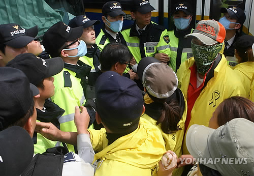 (서울=연합뉴스) 사건팀 = '세월호 1주년' 이후 첫 주말을 맞은 18일 서울 곳곳에서 관련 행사가 열린 가운데 서울 광화문 앞에서 연좌농성을 벌이던 세월호 유가족이 경찰과 충돌하면서 유가족 등 16명이 경찰에 연행됐다.