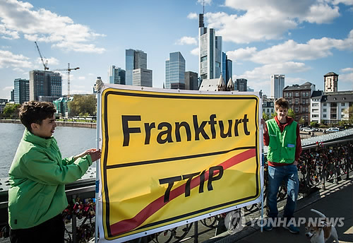(베를린=연합뉴스) 고형규 특파원 = 독일을 비롯한 유럽 주요국 여러 도시에서 18일(현지시간) 미국과 유럽연합(EU)이 추진 중인 자유무역협정(FTA)을 포함한 범대서양무역투자동반자협정(TTIP) 체결 추진을 반대하는 시위가 잇따라 열렸다.