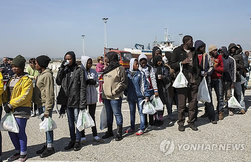 | △ 지중해에서 전복된 난민선에서 구조된 사람들이 15일(현지시간) 이탈리아 남부 항구 도시 코리글리아노에 도착해 함께 모여 있다. (코리글리아노<이탈리아> AP=연합뉴스 자료사진) |