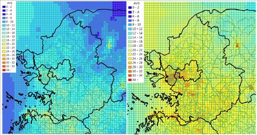 | △ 사진 왼쪽은 '수도권 제2차 대기관리정책'이 효과를 거둬 오는 2024년 대기오염 농도(μg/㎥)가 미세먼지 30, 초미세먼지 20 수준으로 떨어질 경우의 서울과 수도권 모습. 오른쪽은 현재의 대기오염 상황이 개선되지 않은 2024년채 지속될 경우의 모습. 빨간색으로 갈수록 초미세먼지 농도가 높음을 의미한다. |