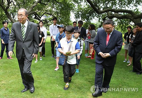 | △ 고향 후배들과 산책하는 반기문 총장 (음성=연합뉴스) 변우열 기자 = 반기문 유엔(UN)사무총장이 지난해 7월 19일(현지시각) 미국 뉴욕의 관저에서 고향인 충북 음성군의 청소년들과 만났다. << 연합뉴스DB >> |