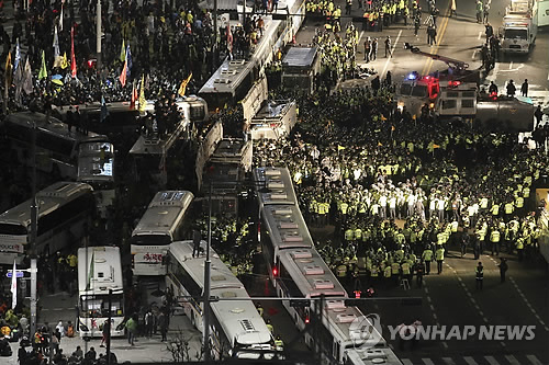 | △ 지난 18일 오후 '세월호 참사 범국민 대회'에 참여한 시민들이 서울 광화문 앞에서 경찰과 대치하고 있다. |