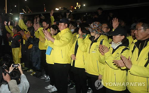 | △ 인사하는 세월호 유가족들 (서울=연합뉴스) 임채두 기자 = 18일 서울 종로구 광화문 누각에서 경찰과 대치 중이었던 세월호 유가족들이 시위를 마치고 함께 해준 시민들에게 인사를 하고 있다. doo@yna.co.kr |
