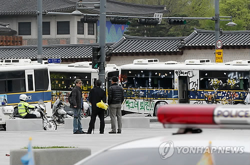 | △ 만신창이 된 경찰 버스 (서울=연합뉴스) 윤동진 기자 = 19일 오전 서울 광화문 앞에 지난 밤 '세월호참사 범국민대회' 행진 참가자들에 의해 손상된 경찰버스가 서 있다. mon@yna.co.kr |