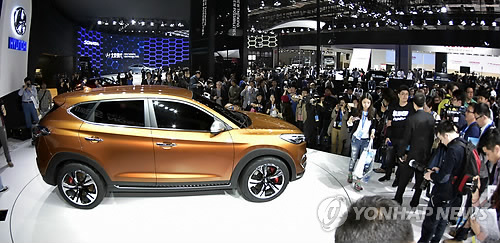 | △ 현대차, 상하이모터쇼서 중국형 '올 뉴 투싼' 첫 공개 (서울=연합뉴스) 현대자동차가 20일 중국 상하이 컨벤션센터에서 열린 '2015 상하이 국제모터쇼'에서 최초로 공개한 중국형 '올 뉴 투싼(현지명: 추웬신투셩)' 콘셉트 모델. << 현대차 제공 >> |
