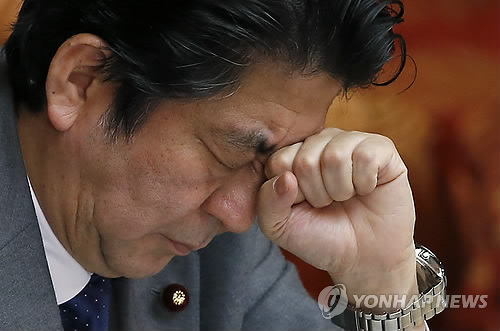| △ (도쿄 AP=연합뉴스) 아베 신조 일본 총리가 지난 1월28일 일본 참의원 회의에 출석해 상념에 잠겨있다. (AP Photo/Shizuo Kambayashi) |
