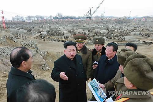 | △ 과학기술전당 현장지도 나선 북 김정은 제1위원장 (평양 조선중앙통신=연합뉴스) 북한 김정은 국방위원회 제1위원장이 평양 대동강 쑥섬의 '과학기술전당' 건설현장을 현지지도했다고 조선중앙통신이 27일 보도했다. 조선중앙통신은 정확한 촬영일시는 밝히지 않았다. 2015.2.27 photo@yna.co.kr |