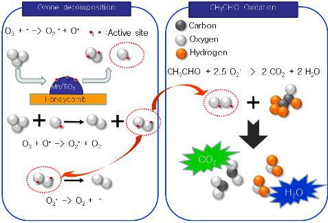 | △ 망간산화물계열(Mn/TiO₂)의 나노촉매 표면에서 공기중 오존(O₃)이 분해되면서 반응성이 강한 산소라디칼이 만들어지고 이 산소라디칼이 아세트알데히드를 분해하면서 이산화탄소와 물이 생성된다. |