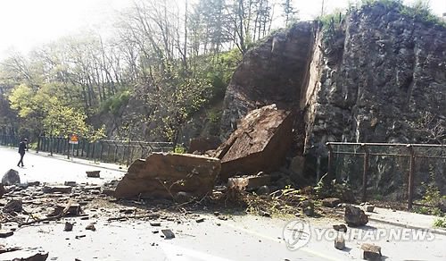 | △ 영동 절개지서 50여t 낙석 (영동=연합뉴스) 박병기 기자 = 21일 오후 3시 40분께 충북 영동군 영동읍 동정리의 편도 1차로 도로 옆 절개지서 무너져 내린 50여t의 바위와 돌이 도로 위에 수북이 쌓여있다.2015.4.21 bgipark@yna.co.kr |
