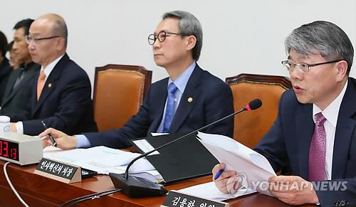 | △ 답변하는 실무기구 김용하 공동위원장 (서울=연합뉴스) 진성철 기자 = 공무원연금 개혁 실무기구 김용하 공동위원장(오른쪽)이 21일 국회 공무원연금 개혁 특별위원회 전체회의에서 답변하고 있다. 오른쪽 부터 김 공동위원장, 이근면 인사혁신처장, 문형표 보건복지부 장관, 김연명 실무기구 공동위원장. |