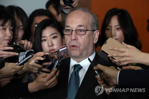 | △ 러셀 美 국무부 동아태 차관보 도어스테핑 (서울=연합뉴스) 전수영 기자 = 대니얼 러셀 미국 국무부 동아태 차관보가 17일 오전 서울 도렴동 외교부 청사 이경수 외교부 차관보와 조태용 1차관을 예방한뒤 청사를 나서며 기자들의 질문에 답하고 있다. 2015.3.17 swimer@yna.co.kr |