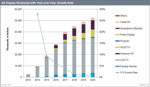 IHS는 "소비자들이 스마트폰과 태블릿 등에서 초고해상도의 장점을 즐기기 시작했다"면서 "모니터나 퍼블릭 디스플레이 시장에서도 4K 디스플레이 채택이 늘어나고 있다"고 전했다.
