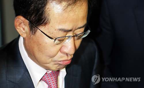 | △ 눈 감고 입 다문 '성완종 리스트' 홍준표 (창원=연합뉴스) 최병길 기자 = '성완종 리스트'에 오른 홍준표 경남도지사가 22일 오전 경남도청으로 출근하며 기자들의 질문에 눈을 감고 굳게 입을 다문 채 집무실로 향하고 있다. 2015.4.22 choi21@yna.co.kr |
