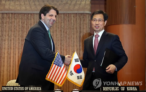 | △ 한미원자력협정 타결 (서울=연합뉴스) 전수영 기자 = 한미원자력협정이 4년 6개월여간의 협상 끝에 타결, 22일 오후 서울 세종로 외교부 청사에서 박노벽 외교부 원자력 협력대사와 마크 리퍼트 주한 미국대사가 협정에 가서명한 뒤 악수하고 있다. |