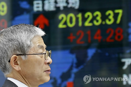 | △ 일본 닛케이 종가, 15년 만에 20,000 돌파 (도쿄 AP=연합뉴스) 일본 닛케이 평균주가(닛케이 225)가 22일(현지시간) 224.81포인트(1.13%) 상승한 20,133.90으로 마감했다. 닛케이가 종가 기준으로 20,000선을 넘은 것은 지난 2000년 4월 14일(20,434.68) 이후 15년 만에 처음이다. 이날 도쿄에서 한 남성이 장중 닛케이주가가 표시된 전광판 앞을 지나고 있다. |