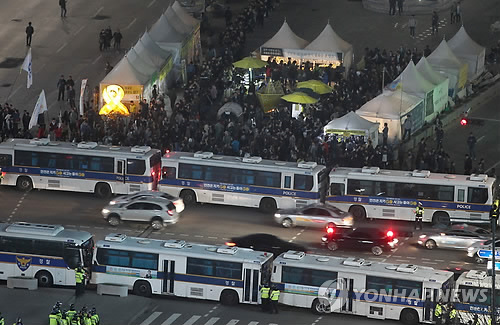 (서울=연합뉴스) 설승은 기자 = 경찰이 '세월호 집회' 관리를 위해 사용하는 차벽이 위헌적인 조치인지를 두고 또다시 논란이 일고 있다.