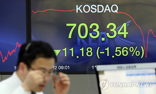 | △ 코스닥 급락 (서울=연합뉴스) 신준희 기자 = 내츄럴엔도텍이 '가짜 백수오' 의혹에 주가가 하한가까지 떨어졌다. 대장주의 급락에 코스닥도 덩달아 출렁했다. 이는 다른 종목에 대한 불안감으로까지 확산되며 일시에 매도 물량이 쏟아지는 계기가 됐다. 700선을 돌파하며 급등세를 이어가던 코스닥은 장중 한때 5% 넘게 폭락했다. 이후 낙폭을 다소 회복한 코스닥은 전날보다 11.18포인트(1.56%) 내린 703.34에 장을 마쳤다. 사진은 이날 오후 서울 명동 외환은행 본점 딜링룸. hama@yna.co.kr |