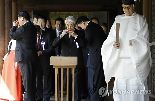 | △ 日 의원들, 야스쿠니 신사 집단 참배 (도쿄 AP=연합뉴스) 일본의 초당파 의원들로 구성된 '모두가 야스쿠니(靖國) 신사를 참배하는 국회의원 모임'의 회장 오쓰지 히데히사 자민당 참의원(가운데)을 비롯한 일본 의원들이 22일 연례 봄 제사 참배를 마친 뒤 신관의 안내에 따라 술을 마시는 의식을 치르고 있다. kjw@yna.co.kr |