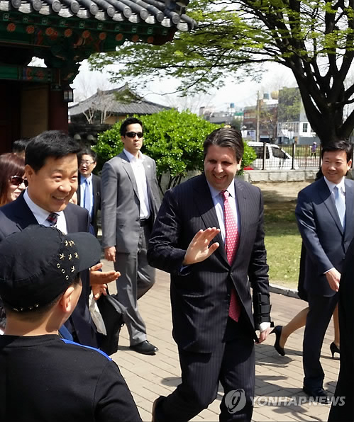 | △ "안녕하세요 미국 대사입니다" (경주=연합뉴스) 김용민 기자 = 23일 경북 경주를 찾은 마크 리퍼트 주한미국대사가 관광객들에게 반갑게 손을 흔들고 있다. 2015.4.23 yongmin@yna.co.kr |