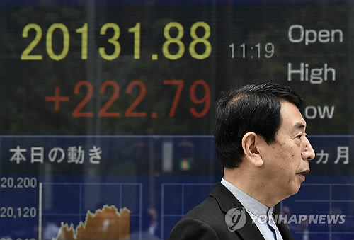 | △ 도쿄증시 닛케이평균주가가 20,000선을 다시 넘어선 22일(현지시간) 도쿄에서 한 남성이 증권사 전광판 앞을 지나가는 모습. (EPA=연합뉴스) |