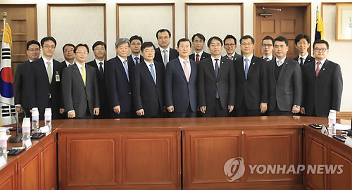 | △ 법원·변호사단체 '재판 예절' 공동 연구 (서울=연합뉴스) 서울중앙지법(법원장 이성호)은 23일 서울지방변호사회(회장 김한규)와 '소송절차개선 연구협의회' 첫 전체 회의를 했다. 연구협의회는 이 법원장과 김 회장 등 양측 16명으로 구성됐으며 주기적으로 만나 법관과 변호사의 바람직한 언행과 재판 예절을 중점적으로 논의한다. <<서울중앙지법 제공>> 2015.4.23 mina@yna.co.kr |