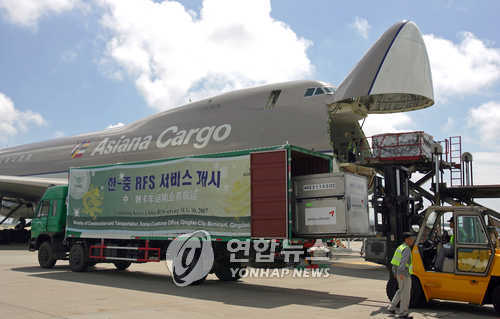 | △ 인천국제공항을 통한 올해 1분기 수출입 교역액이 분기 기준으로 역대 최대치를 기록했다. 사진은 중국화물운송 트럭의 화물이 아시아나 카고에 실리는 장면.(연합뉴스 자료사진) |