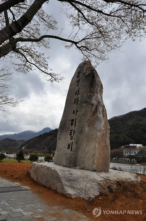 | △ 문경새재아리랑비 (문경=연합뉴스) 경북 문경시가 23일 문경새재도립공원 입구에 세운 문경새재아리랑비. 2015.4.23 << 문경시 >> sds123@yna.co.kr |
