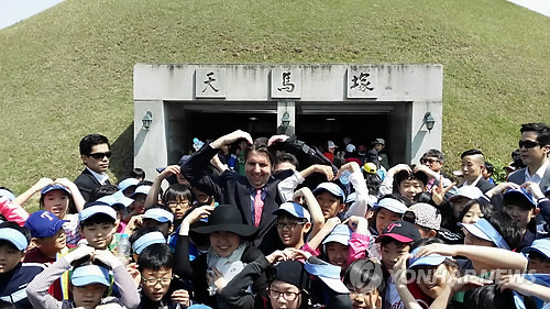 | △ "사랑합니다" (경주=연합뉴스) 김용민 기자 = 23일 경북 경주를 찾은 마크 리퍼트 주한미국대사가 천마총 앞에서 어린이 관광객들과 하트를 그려 보이고 있다. 2015.4.23 yongmin@yna.co.kr |