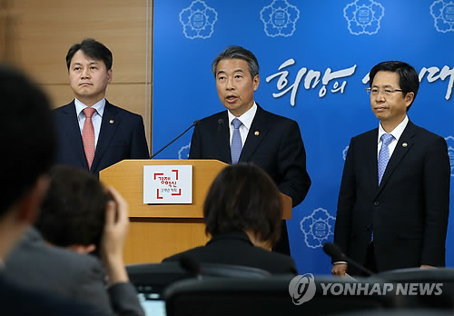 | △ 정부, 공무원 총파업 엄정 대응 (서울=연합뉴스) 전수영 기자 = 정종섭 행정자치부장관(가운데)이 23일 오전 정부서울청사에서 부처 합동으로 불법 파업에는 엄정 대응하고 공무원과 교사들의 총파업 참여도 엄격히 금지한다는 내용을 담은 대국민 담화를 발표하고 있다. 왼쪽부터 김주현 법무부차관, 정 장관, 김재춘 교육부차관. |