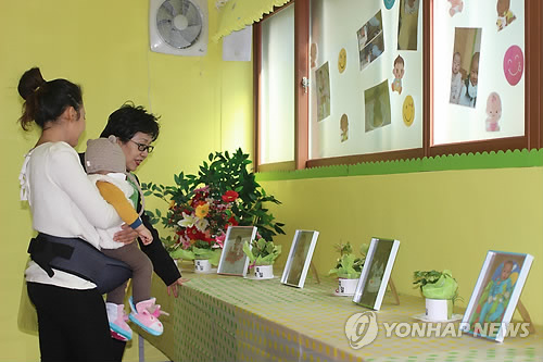 | △ '희망의 보금자리' 이주여성지원센터 100일 잔치 (서울=연합뉴스) 고현실 기자 = 23일 서울 구로구 오류동 이주여성지원센터에서 열린 '센터 100일 잔치'에서 센터 관계자들이 입소 아동들의 사진을 보고 있다. 이주여성지원센터는 예기치 않은 임신과 출산으로 어려움을 겪는 이주여성들을 위해 지난 1월 14일 문을 열었다. 2015.4.23 okko@yna.co.kr |