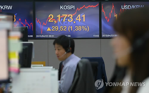 | △ 코스피 상승 (서울=연합뉴스) 김도훈 기자 = 코스피지수가 전날보다 29.52포인트(1.38%) 오른 2,173.41로 장을 마감한 23일 오후 서울 중구 외환은행 본점 딜링룸에서 딜러들이 업무를 보고 있다. |