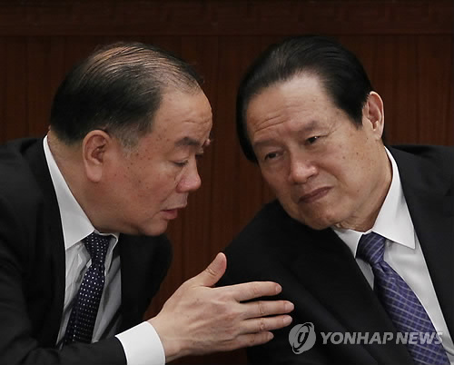 | △ 권력무상, 中 '사법·공안 차르'도… (AP=연합뉴스) 중국 검찰이 부패 혐의로 송치된 저우융캉(周永康) 전 중국 공산당 중앙정치국 상무위원을 3일 정식 기소했다. 중국 톈진(天津)시 인민검찰원은 이날 톈진시 제1중급인민법원에 저우융캉에 대한 공소장을 제출했다. 검찰은 저우의 범죄 혐의로 뇌물수수, 직권남용, 국가기밀 고의 누설 등 3가지를 제시했다. 저우융캉은 후진타오(胡錦濤) 체제에서 최고지도부 일원인 정치국 상무위원과 공안·사법·정보 분야를 총괄하는 당 중앙정법위 서기를 지낸 인물. 사진은 그(오른쪽)가 공산당 중앙정치국 상무위원, 당 중앙정법위 서기이던 지난 2012년 3월9일 베이징 인민대회당의 전국인민대표대회 전체회의에서 당시 중앙정법위 부서기 왕러취안의 얘기를 듣고 있는 모습. bulls@yna.co.kr |