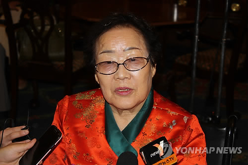 | △ 인터뷰하는 이용수 할머니 (워싱턴=연합뉴스) 노효동 특파원 = 지난 2007년 미국 하원 청문회에 나와 증언했던 일본군 위안부 피해자 이용수(87) 할머니가 21일(현지시각) 8년 만에 미국 하원을 다시 찾아 워싱턴 특파원들과 인터뷰를 하고 있다. 2015.4.22 rhd@yna.co.kr |