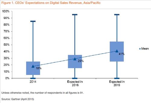 24일 미국의 IT 리서치·컨설팅 전문업체인 가트너가 발표한 '2015 CEO 설문조사: 아시아·태평양 지역의 디지털 여정 가속화' 보고서에 따르면 아·태 지역 CEO들은 디지털 관련 매출이 앞으로 상당히 증대될 것으로 내다봤다.