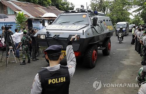 | △ (AP=연합뉴스 자료사진) 호주인 마약사범 사형수 2명을 호송하는 인도네시아 경찰 장갑차가 지난달 인도네시아 중부 자바 칠라차프의 위자야푸라 항에 도착하고 있다. |