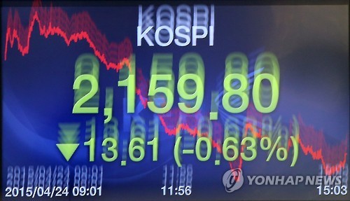 (서울=연합뉴스) 임수정 기자 = 코스피가 단기 급등에 따른 부담과 차익 실현에 나선 투자자들의 매도 물량으로 2,150선대로 밀렸다.
