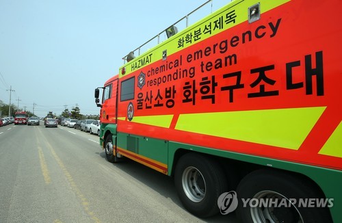 | △ 울산 온산공단서 가스 누출 조사하는 소방당국 (울산=연합뉴스) 김용태 기자 = 24일 오전 울산시 울주군 온산공단에서 울산소방 화학구조대가 가스 누출 조사를 벌이고 있다. 이날 현대중공업 온산공장 주변에서 가스 냄새가 나고 일부 직원들이 호흡곤란 증세를 보인다는 신고가 접수됐다. 2015.4.24 yongtae@yna.co.kr |