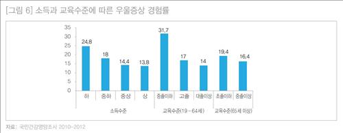우울 증상 경험은 소득이 낮을수록 높았다. 소득 수준을 '하', '중하', '중상', '상' 등 4개 집단으로 나눠 우울 증상 경험률을 살핀 결과 소득이 '하'인 여성의 우울 증상 경험률은 24.8%로, '상'인 경우의 13.8%보다 1.8배 높았다.