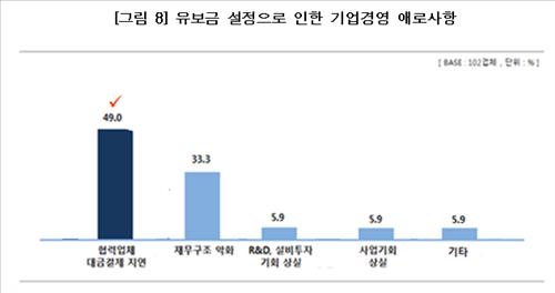 전체 조사 대상 기업 중 83.1%가 유보금 설정에 부정적이라고 답했는데 '협력업체 대금결제 지연'(49.0%)과 '재무구조 악화'(33.3%), '연구개발·설비투자 기회 상실'(5.9%) 등이 주된 애로사항이었다.