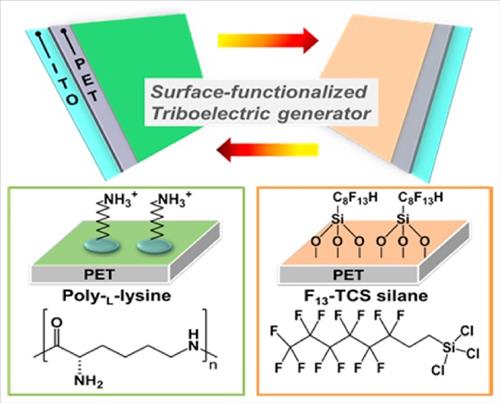 먼저 PET 필름 표면을 산소플라즈마로 처리한 다음 필름 하나에는 마찰 시 전자를 내어주는 성질이 강한 물질(폴리-L-라이신)을 결합시키고 다른 필름 표면에는 전자를 끌어들이는 성질이 강한 물질(트리클로로 실란=FOTS)를 결합시켰다.