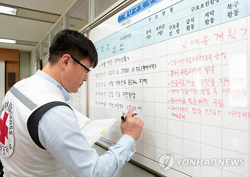 | △ 적십자, 네팔지진 긴급재난구호대책본부 설치·운영 (서울=연합뉴스) 27일 서울 중구 대한적십자사 긴급재난구호대책본부에서 직원들이 재난구호상황판에 네팔 현지 상황을 기록하고 있다. 대책본부는 국제적십자사연맹, 네팔적십자사와 공조체제를 유지하고 있으며, 현재 25만 불 상당의 국제재난 긴급구호품 네팔 현지 지원, 긴급구호선발대 및 긴급의료단 구성 및 파견을 준비하고 있다. (대한적십자사 제공) |
