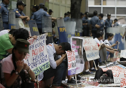 | △ 印尼, 마약사범 28일 사형집행 가능 (마닐라 AP=연합뉴스) 27일(현지시간) 필리핀 마닐라 교외 마카티의 인도네시아 대사관 앞에서 필리핀 출신 마약 사범으로 인도네시아에서 사형 선고를 받은 마리 제인 벨로소에 대한 사형 집행 중단을 촉구하는 연좌 농성이 벌어지고 있다. 인도네시아 당국이 사형 선고를 받은 외국인 마약 사범 8명에게 지난 25일 형 집행을 통보한 상황인 가운데 28일 사형이 집행될 수 있을 것으로 보인다. bulls@yna.co.kr |