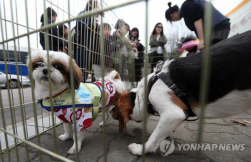 | △ 유기동물 입양 행사장에 강아지들이 입양을 기다리고 있다.(연합뉴스 자료사진) |