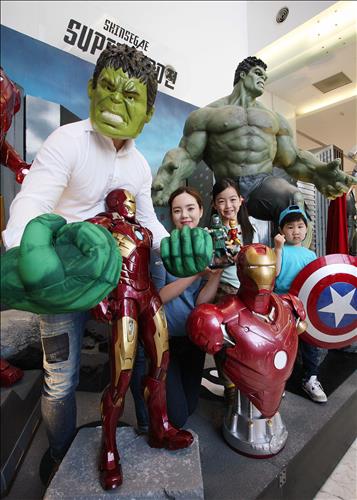신세계는 영화 어벤져스2 개봉에 맞춰 점포별로 아이언맨, 헐크, 토르, 캡틴 아메리카 등 영화에 나오는 영웅 캐릭터를 실제 크기의 모형 등으로 만날 수 있는 '슈퍼 히어로전'을 개최한다.