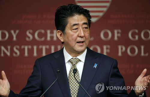 | △ 아베 신조 일본 총리가 하버드대학교 공공정책대학원에서 강연하고 있다. (AP=연합뉴스) |