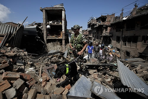 | △ 한 명이라도 더 찾아야 할텐데 (카트만두 AP=연합뉴스) 대지진이 강타한 네팔 수도 카트만두 교외 박타푸르에서 27일(현지시간) 구조대원이 탐지견과 함께 폐허 더미 사이를 살피며 지나고 있다. |