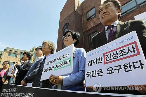 | △ '성완종 리스트' 수사 촉구하는 시민단체 (서울=연합뉴스) 이승민 기자 = 참여연대 등 시민단체 회원들이 28일 오전 서울 종로구 청운효자동 주민센터 앞에서 기자회견을 열고 '성완종 리스트'에 대한 철저한 수사를 촉구하고 있다. 2015.4.28 logos@yna.co.kr |