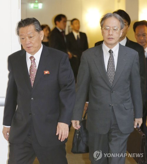 | △ 회담장 향하는 북일 협상 대표 (스톡홀름 교도=연합뉴스) 북한과 일본이 26일(현지시간) 스웨덴 스톡홀름에서 정부간 공식 협상을 재개했다. 스톡홀름 시내의 한 호텔에서 만난 송일호(왼쪽) 북한 북일국교정상화교섭 담당대사와 이하라 준이치(伊原純一) 일본 외무성 아시아대양주국장이 나란히 회담 장소를 향하고 있다. 2014.5.26 <<국제뉴스부 기사참조>> jhcho@yna.co.kr |