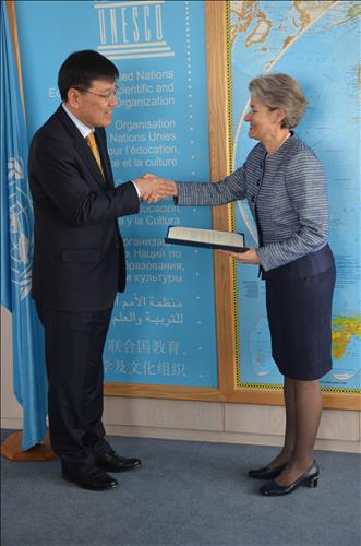 | △ (파리=연합뉴스) 이병현 주유네스코 신임 대사가 28일(현지시간) 파리 유네스코 본부에서 이리나 보코바 유네스코 사무총장에게 신임장을 제정하고 인사하고 있다. 2015.4.29 <<주 유네스코 한국대표부 제공>> photo@yna.co.kr |