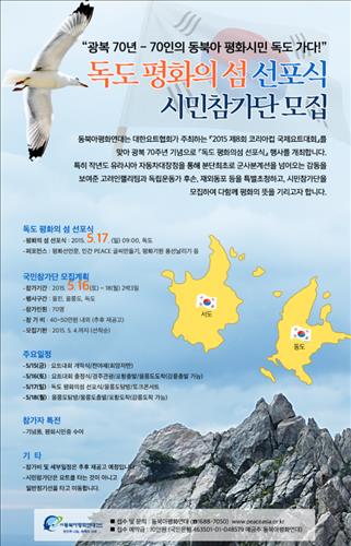 ㈔동북아평화연대는 다음 달 16∼18일 국내외 참가자 70명과 함께 울릉도, 독도를 방문하는 '광복 70년-70인의 평화시민 독도 가다' 행사를 연다고 29일 밝혔다.